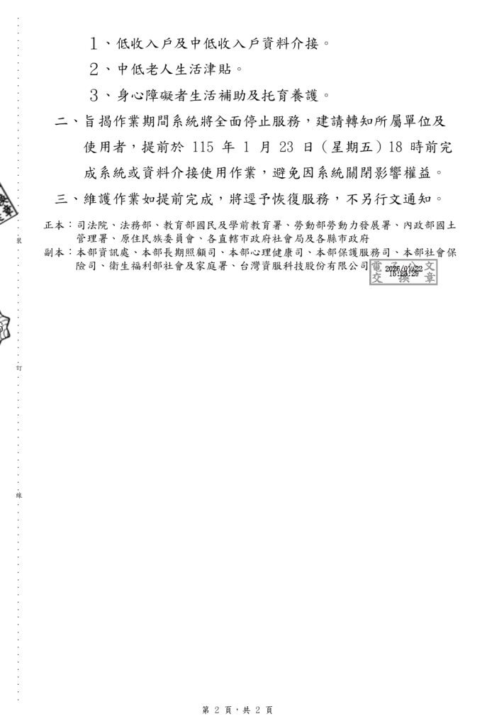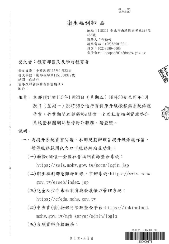 主 旨:轉知衛生福利部預計於115年1月23日(星期五)18時30分至同年1月26日(星期一)23時59分進行資料庫升級搬移與系統維護作業,作業期間衛生福利部弱勢e關懷─全國社會福利資源整合系統暨相關網站暫停對外服務Post category:各處室公告Post last modified:2026-01-28Post author:資料組長說 明:依據衛生福利部115年1月22日衛部救字第1151360379號函辦理。 Post Views: 7Read more articles上一篇文章114-1學期_高中部學期補考名單