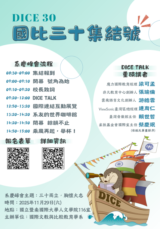 國立暨南國際大學國際文教與比較教育學系辦理系慶「三十而立,胸懷大志」,敬請惠予協助公告並鼓勵學生踴躍報名參加