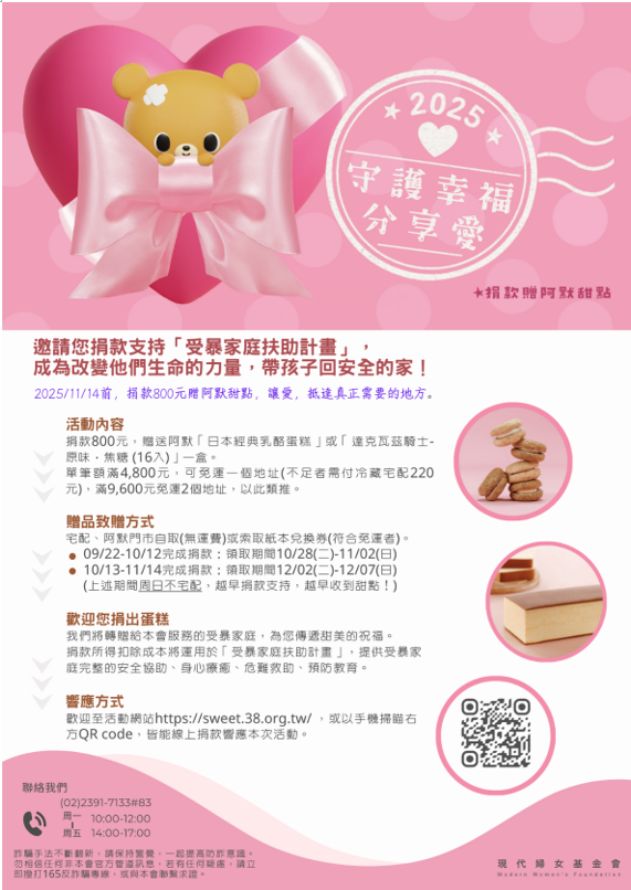 四、歡迎透過本會「2025守護幸福分享愛」活動網頁線上捐款https://sweet.38.org.tw,或傳真回覆紙本捐款單捐款(詳見附件一)。