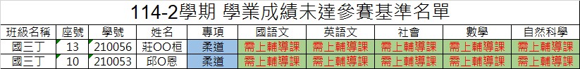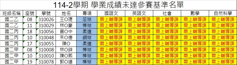 114-2學期 (國中部)學業成績未達參賽基準學生名單Post category:各處室公告 / 教學組公告 / 教學組課業輔導Post last modified:2026-02-12Post author:教學組請各班及各專項的師長,督促名單上的學生,於2/23(一)下午放學前,到教學組填寫上課申請單或是放棄上課單。事關學生參賽權益及各專項出賽人員排配,提醒各專項師長督促及監督學生,謝謝。 Post Views: 56Read more articles上一篇文章檢送「2026年臺日國際教育交流推動零碳學校(Zero Carbon School)研討會實施計畫」,邀請對於推動零碳校園有興趣之學校師長參加