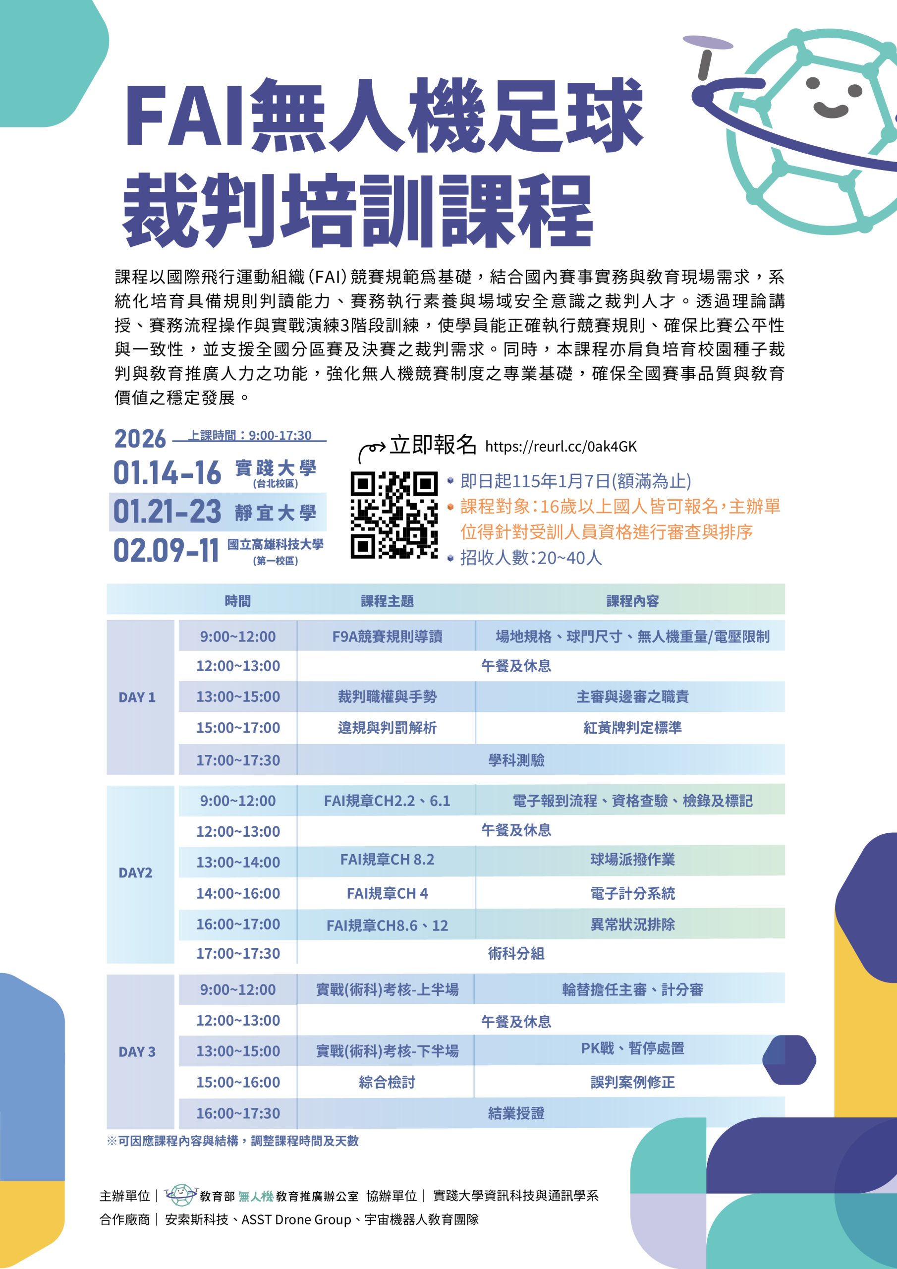 一、 課程主旨在培育校園種子裁判與教育推廣人力之功能,強化無人機競賽制度之專業基礎,確保全國賽事品質與教育價值之穩定發展。