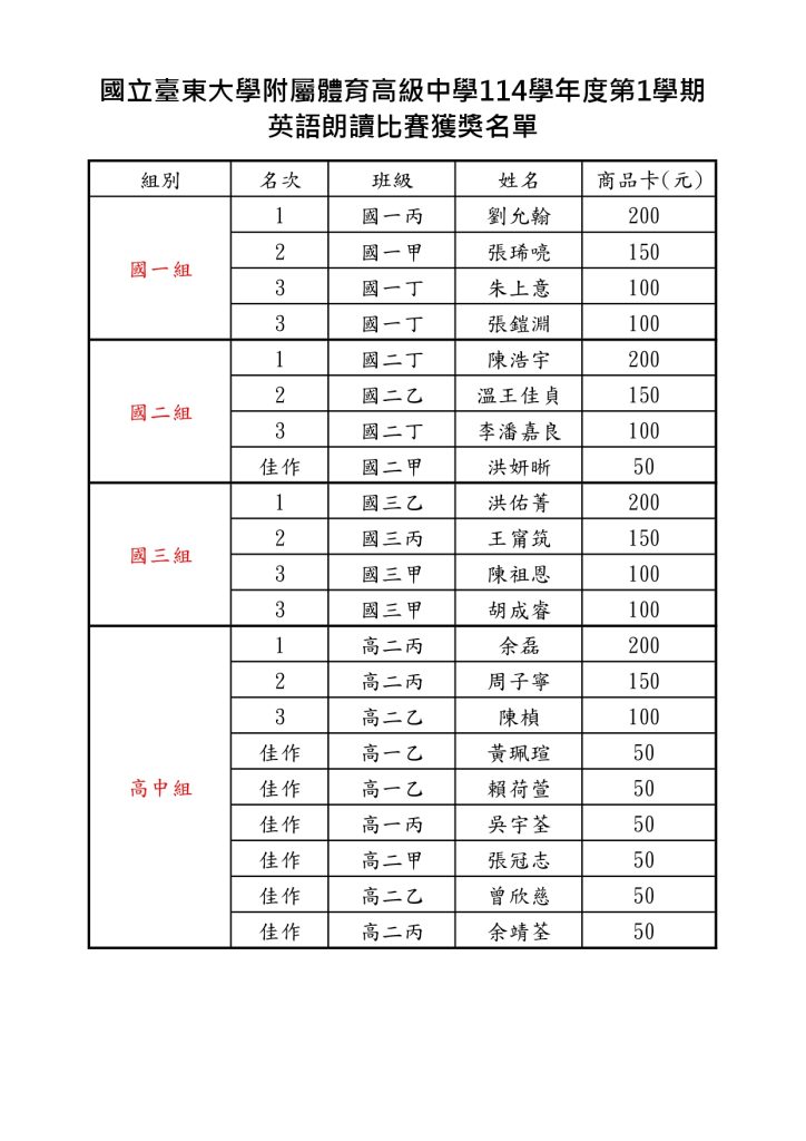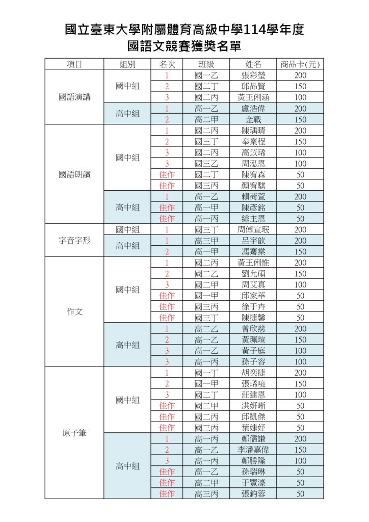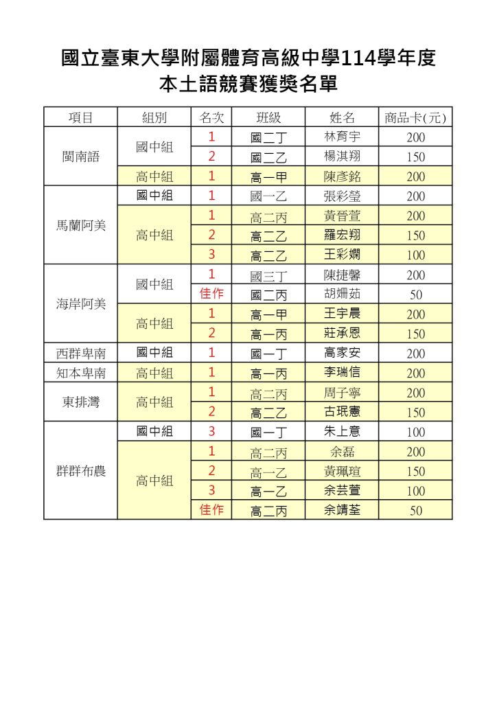 本校114學年度國語文競賽、本土語競賽、英語朗讀比賽獲獎名單Post category:各項競賽 / 教學組 / 教學組公告Post last modified:2025-11-13Post author:教學組說明:獲獎同學另擇日通知頒發獎狀及商品卡 Post Views: 27Read more articles上一篇文章114學年度第1學期英文朗讀競賽場地排配及出場順序