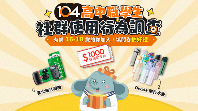一零四資訊科技股份有限公司【104人力銀行】邀請高中職生填寫社群使用行為調查問卷,分享想法即有抽獎機會,鼓勵高一至高三學生踴躍參與。Post category:學務處Post last modified:2025-12-17Post author:ntpehs015一、 目的:藉由問卷結果了解全臺高中職生社群的使用狀況與關注的內容話題,以提供學生更具實用性與豐富度的社群資訊。 二、 活動時程:即日起至 2026/1/31。 三、 調查對象:高一至高三生。 四、 問卷獎勵:符合問卷調查條件並完整填寫者,即有機會獲得:即享券$1,000元(十名)、 富士底片相機(五名)與 Owala 隨行水壺(三名) 五、 問卷連結:https://students104.pse.is/8fsnpx海報下載 Post Views: 10Read more articles上一篇文章臺東縣政府辦理本縣「115下半年度表演藝術活動申請補助暨場地租借申請審查」,鼓勵有興趣之師長及同仁單位踴躍送件。