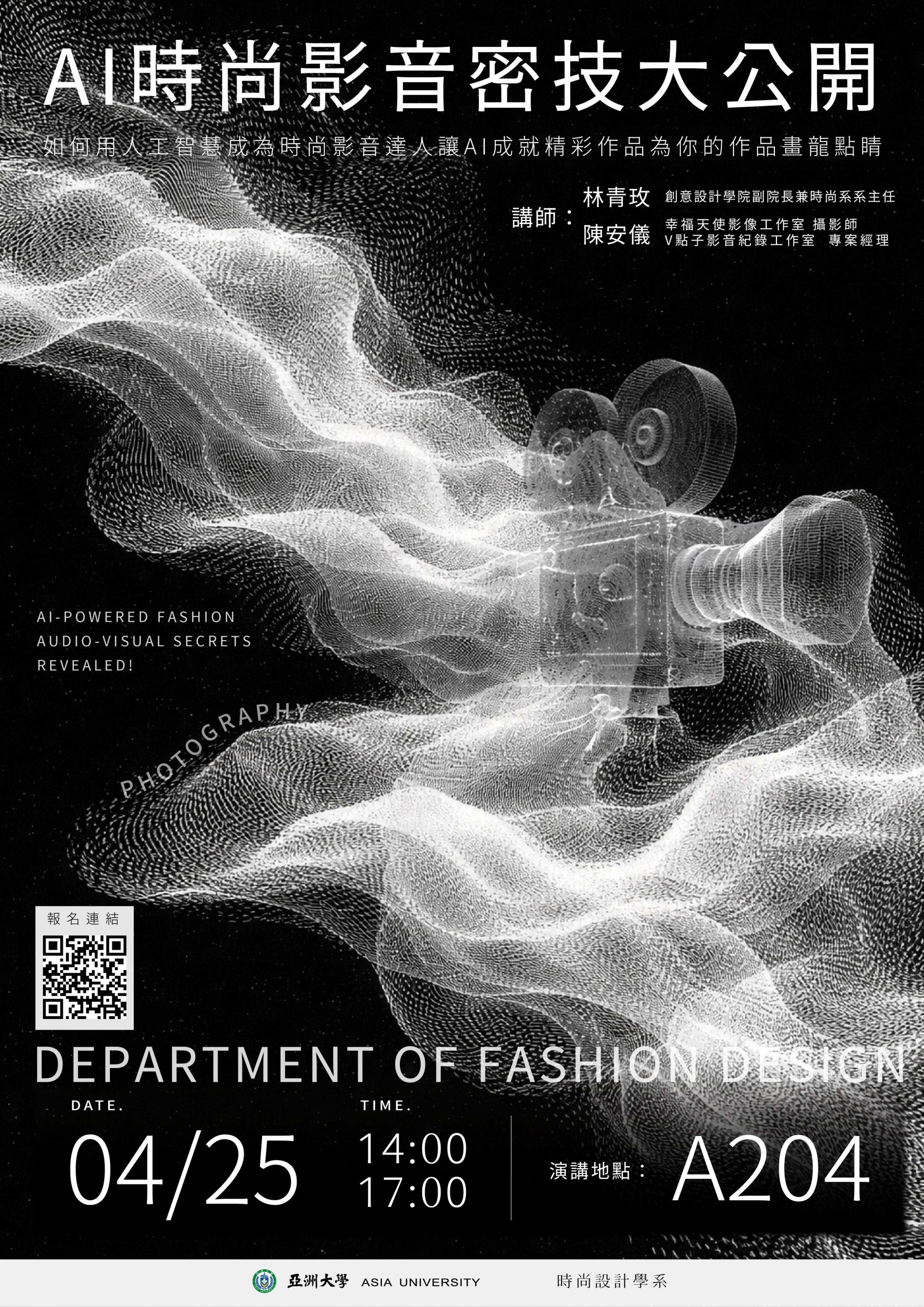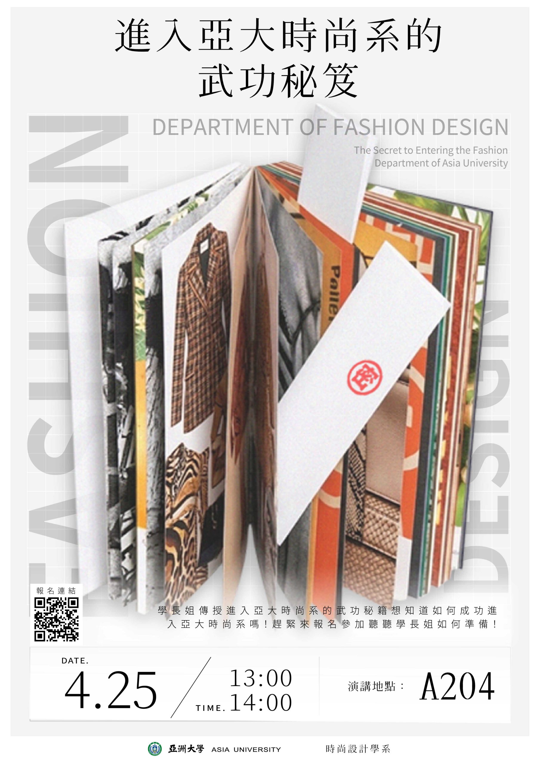 一、 為協助學生探索時尚設計領域與特色,亞洲大學時尚設計學系訂於115年4月25日(星期六)辦理工作營,地點為亞洲大學A204教室(亞洲大學A棟創意設計學院大樓2樓)。