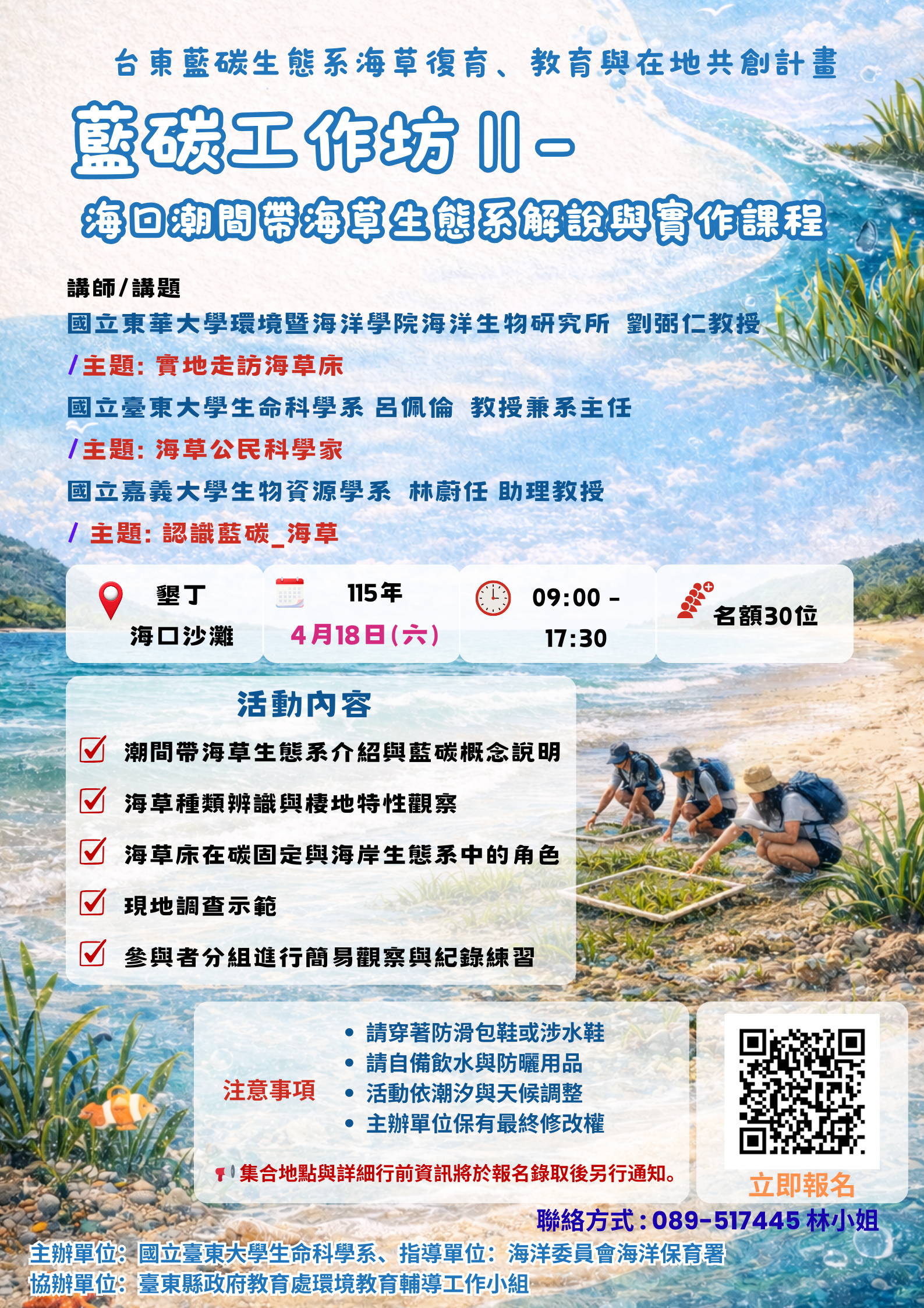 一、 為推廣藍碳生態系統與海草碳匯在氣候變遷中之重要角色,本校藍碳團隊特辦理旨揭工作坊,將帶領參與者前往墾丁海口港沙灘實地觀察海草棲地生態。期透過專家導覽、現地觀察與交流分享,提升大眾對海洋生態之認識,並共同探索海洋保育與永續發展之行動方案。