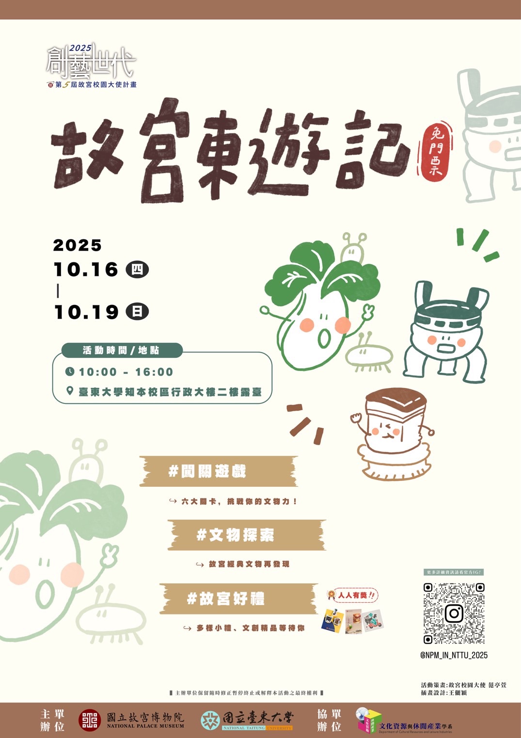 國立臺東大學舉辦「故宮東遊記」校園推廣活動海報與相關資料如附件,鼓勵學生踴躍參與。Post category:學務處Post last modified:2025-10-02Post author:ntpehs015一、 本活動為國立故宮博物院與本校共同舉辦之校園推廣計畫,由故宮校園大使策劃執行,旨在透過創意文化體驗拉近年輕世代與故宮的距離,將故宮典藏之美推廣至臺東地區校園與社區,期盼促進師生及市民對故宮的認識與活動參與。二、 活動期間為114年10月16日(星期四)至114年10月19日(星期日),地點位於國立臺東大學知本校區行政大樓二樓露臺舉辦,活動內容包含文物互動體驗、文化推廣展示與故宮好禮抽獎,誠摯邀請師生共襄盛舉。海報下載 Post Views: 5Read more articles上一篇文章中原大學永續環境營造研究中心及設計學博士學位學程劉為光副教授執行桃園市政府文化局「114年桃園眷村文化論壇」之電子邀請卡及宣傳海報各1份。下一篇文章慈濟學校財團法人慈濟大學訂於114年11月1-2日(星期六-日)辦理「2025 AI 音樂創作營」,鼓勵學生踴躍報名參與。