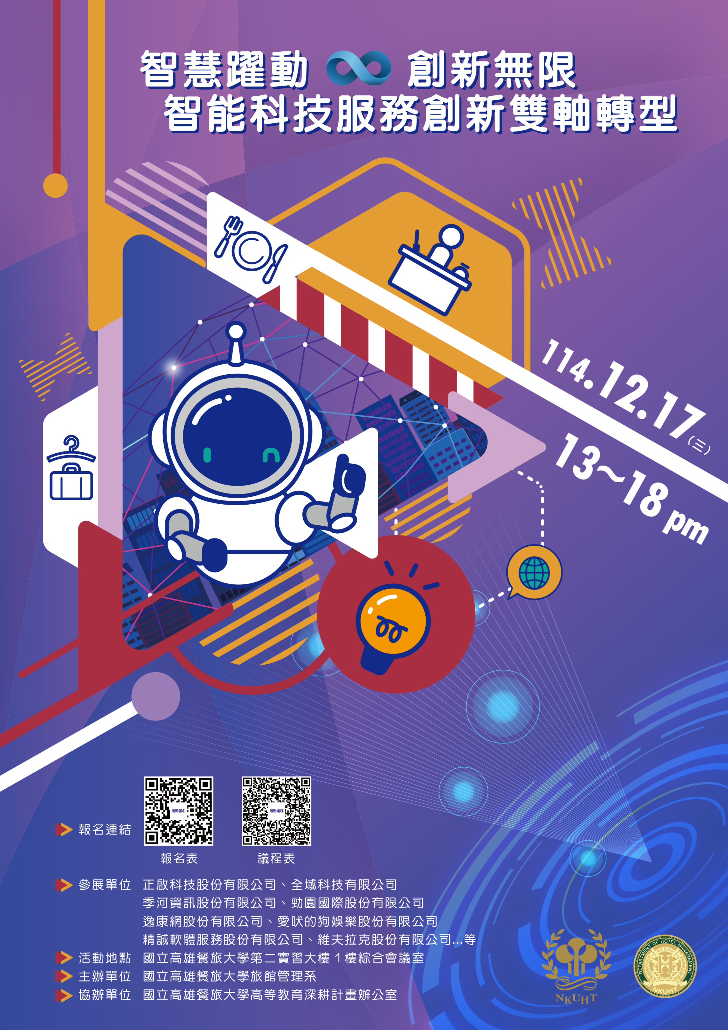 國立高雄餐旅大學 旅館管理系舉辦「智慧躍動 ️創新無限-智能科技服務創新雙軸轉型」活動海報1份,鼓勵參與。Post category:學務處Post last modified:2025-11-20Post author:ntpehs015一、 旨揭活動謹訂於114年12月17日(星期三)下午1時至6時辦理。活動地點為本校第二實習大樓一樓綜合會議室。二、 本次活動將邀請旅館業者與資訊科技廠商進行展示交流,促進跨領域的互動合作,激發更多創新應用的可能,誠摯邀請各高中職及大專校院師長蒞臨。三、 請貴校惠予同意參與人員公(差)假登記出席。四、 活動報名連結: https://forms.cloud.microsoft/r/fjbfd1YVPj,報名即日起至114年12月8日(星期一)。海報下載 Post Views: 5Read more articles上一篇文章建國科技大學美容系美容科技碩士班辦理115級「Timeless」畢業成果展活動,鼓勵師生蒞臨參觀。