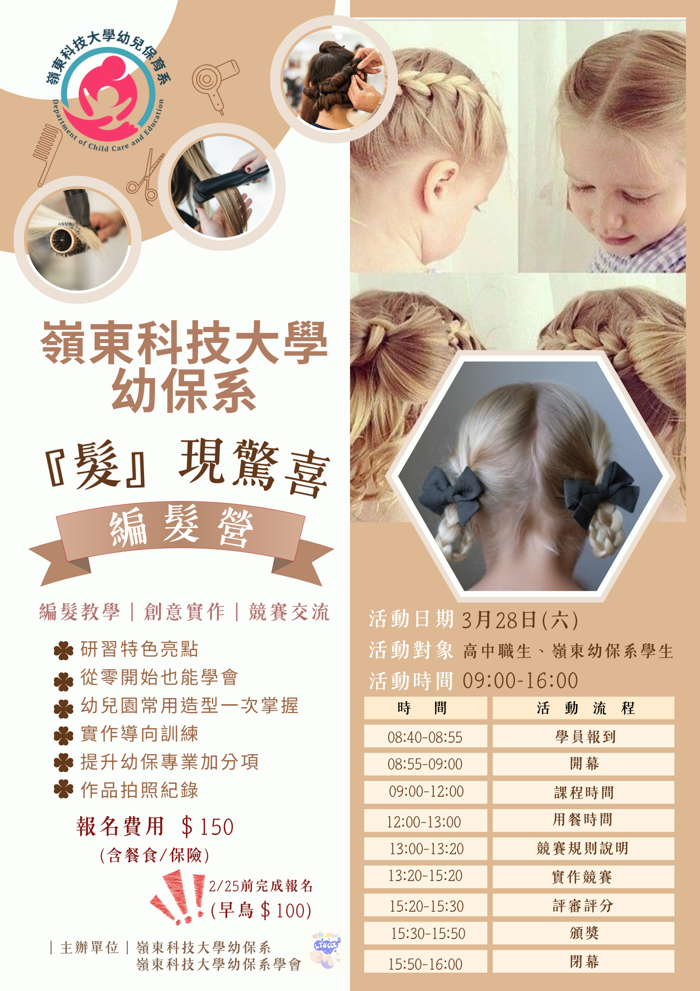 二、 本活動將於115年03月28日(星期六)上午9時至16時,嶺東科技大學幼兒保育系仙庭樓1樓HT106教室舉行。