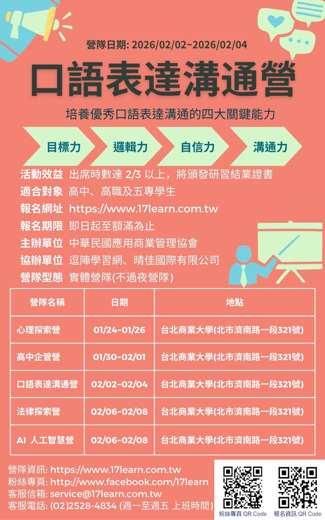 一、無論是升學口試或求職面談,口語表達已經是現代人不可或缺的能力。「口語表達溝通營」透過講解、示範、訓練和不斷的演練,克服公開發言的恐懼,人人都可以成為口語表達的高手!一、營隊效益:出席時數達 2/3 以上,將頒發主辦單位之研習證明。