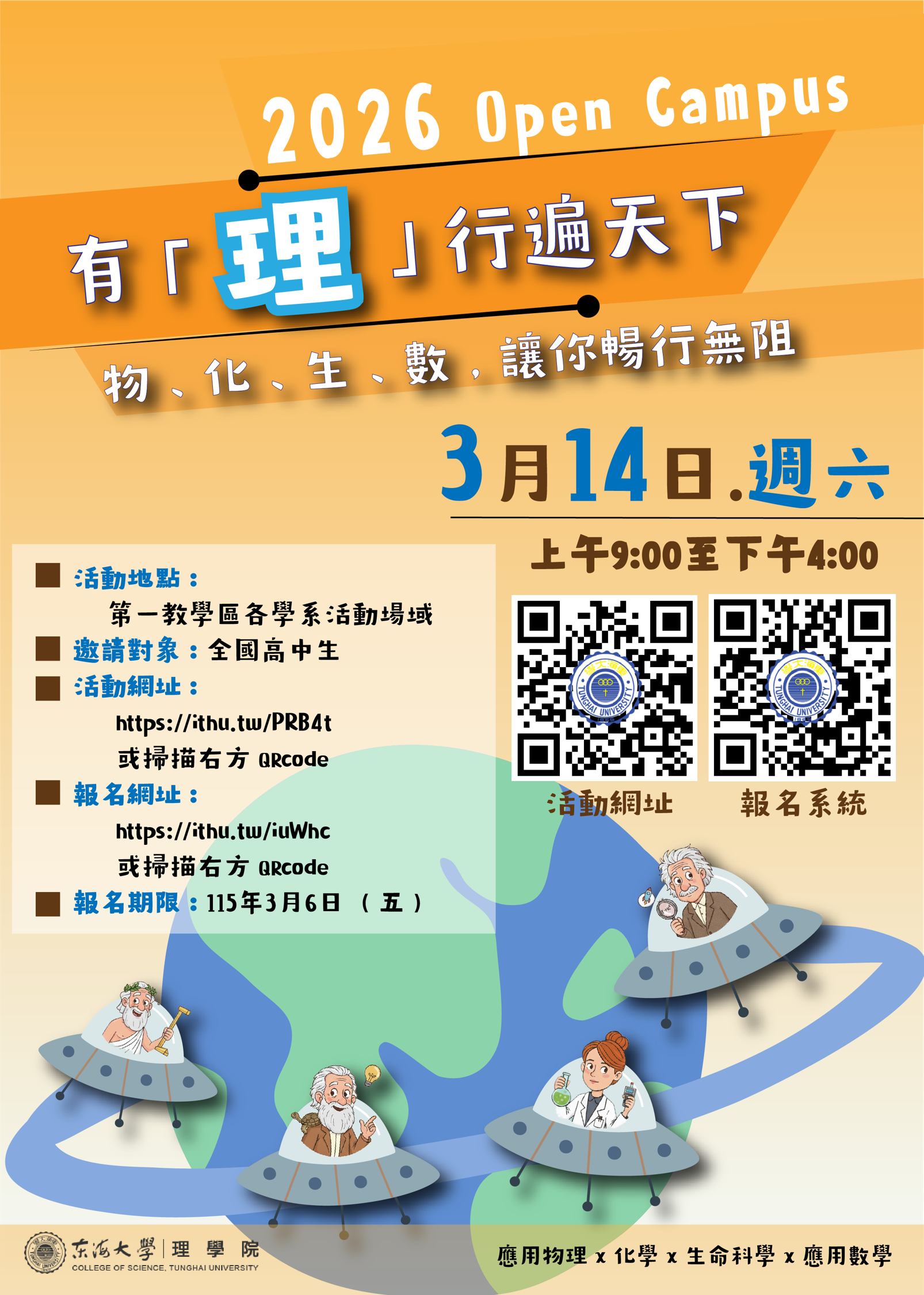 東海大學 理學院辦理「2026年Open Campus 有『理』行遍天下,物.化.生.數.讓你暢行無阻」活動海報,鼓勵學生踴躍報名參加。Post category:學務處Post last modified:2026-02-04Post author:ntpehs015一、 活動時間:115年3月14日(星期六)。二、 動地點:東海大學理學院各學系實驗室。三、 報名日期:即日起至115年3月6日(星期五)止。四、 報名方式:報名連結請參閱活動海報,或登入東海大學報名系統(網址https://ithu.tw/iuWhc),活動內容則請參閱活動流程或登活動網頁介紹(網址https://ithu.tw/PRB4t)。附件一下載附件二下載 Post Views: 7Read more articles上一篇文章國立科學工藝博物館 「115年科學小樹苗」公益活動,鼓勵踴躍報名參加。