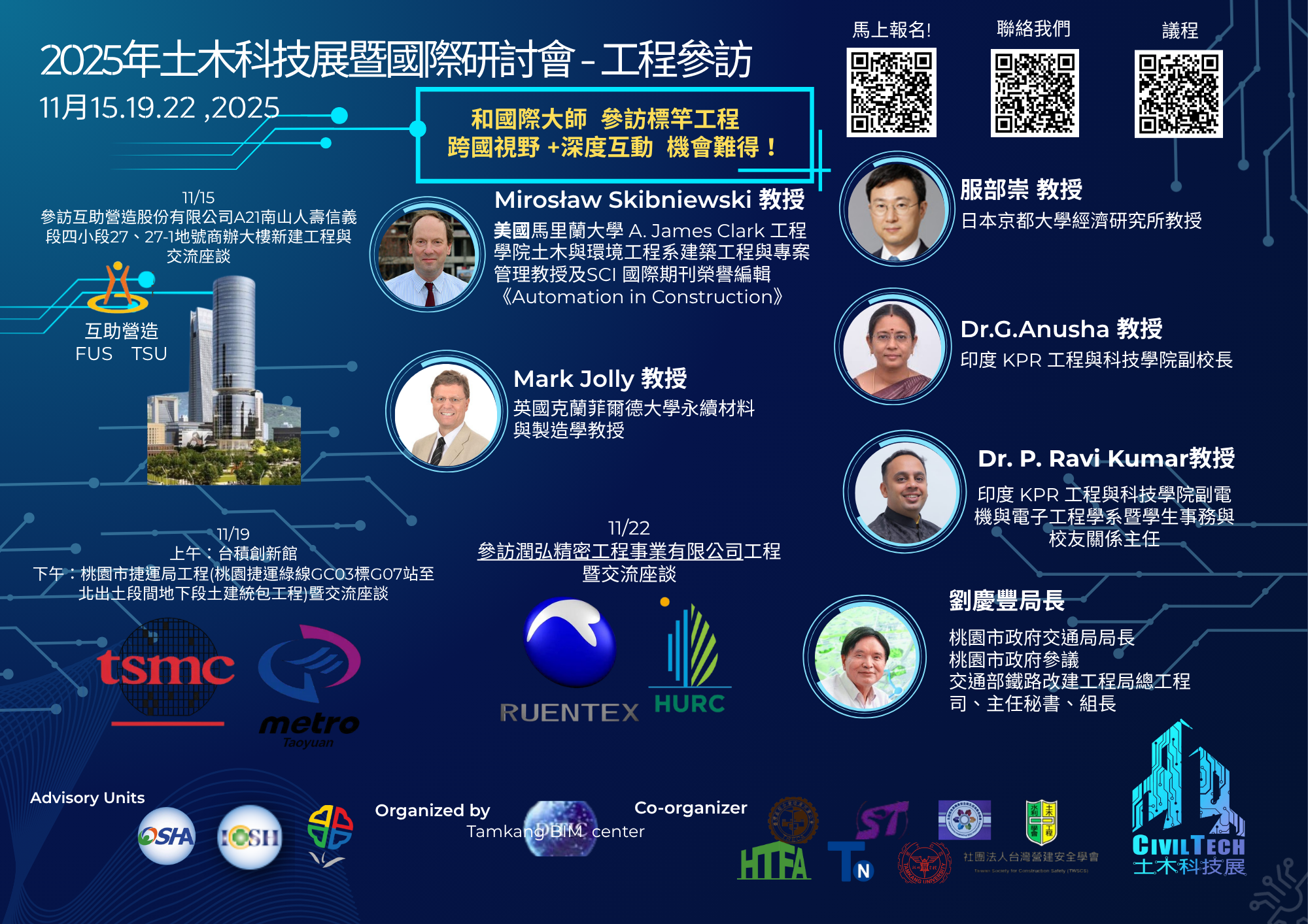 一、 旨揭活動為該中心主辦之「2025土木科技展暨國際研討會」系列活動之一,與5名國際大師參與3場工程參訪,深入了解臺灣工程的實力: