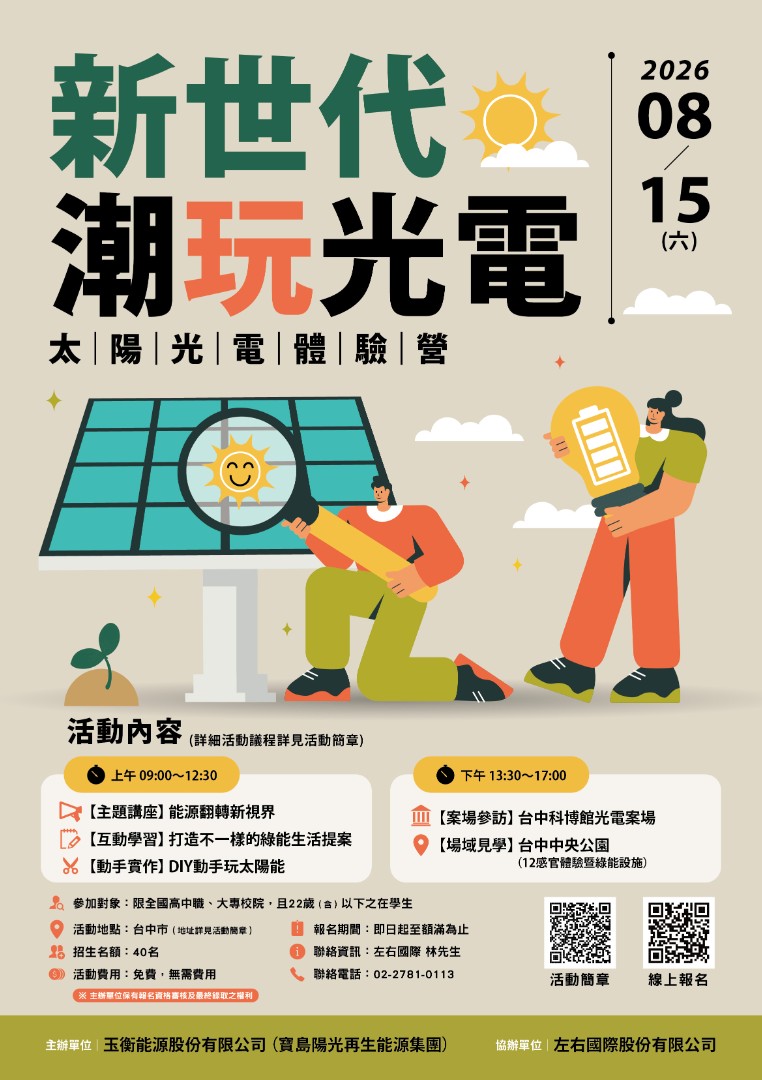 玉衡能源股份有限公司預計115年8月15日(星期六)辦理「2026年全國大專校院暨高中職學生太陽光電體驗營」,鼓勵學生踴躍報名參加,聯絡方式及活動內容詳如附件。Post category:學務處Post last modified:2026-04-24Post author:ntpehs015附件1下載附件2下載 Post Views: 8Read more articles上一篇文章國立中央大學訂於115年5月16日辦理線上講座:《蓋婭科普講座系列 59》—— 「非快速動眼期睡眠中恐懼記憶的選擇性調節」,鼓勵師生踴躍報名參加。下一篇文章鼓勵師生蒞臨參與實踐大學時尚設計學系第十六屆畢業製作展演系列活動。
