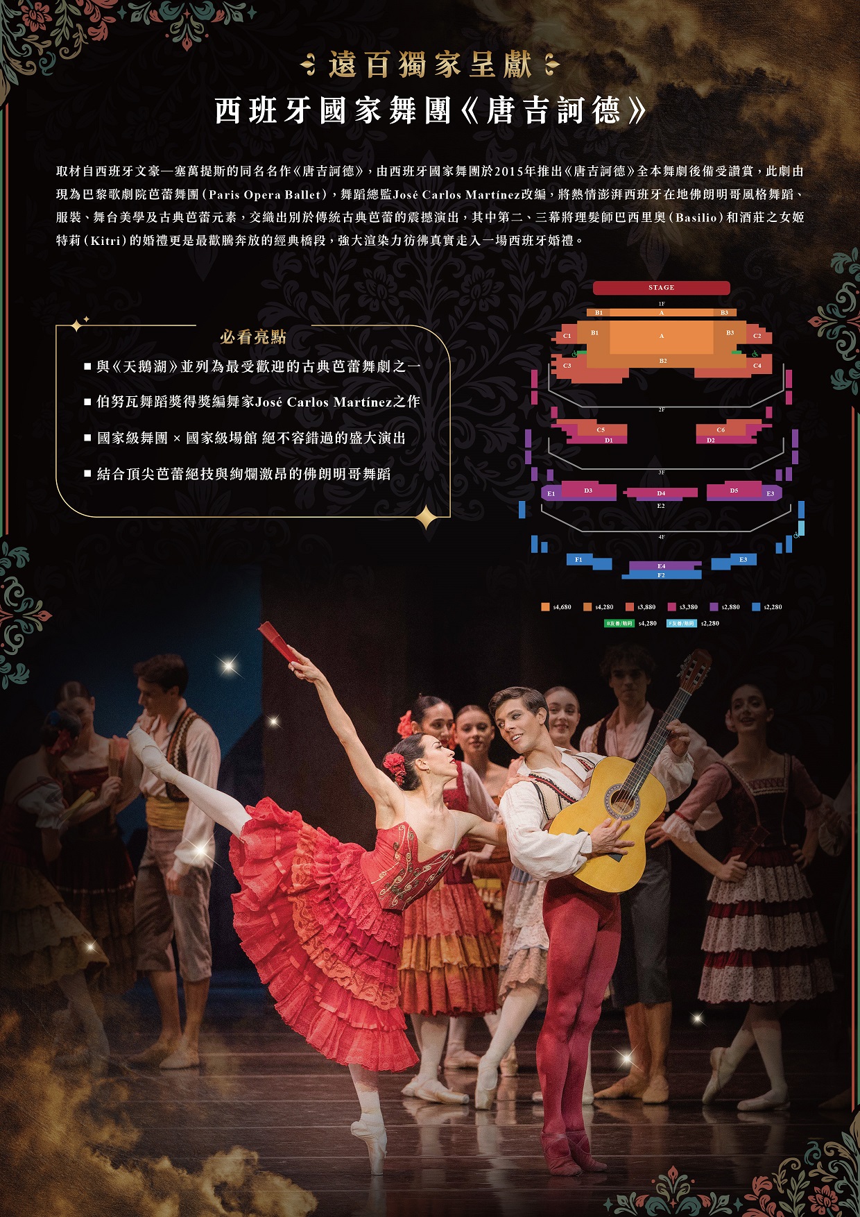 (二)西班牙國家舞團自創立以來,歷經多位世界級藝術總監領軍,在古典與當代之間不斷拓展藝術疆界,兼具技術實力與文化深度。此次來台演出的《唐吉訶德》,更被視為舞團詮釋古典芭蕾語彙與西班牙民族精神的代表之作,充分體現其「以國家文化為根,與國際舞台對話」的藝術定位。