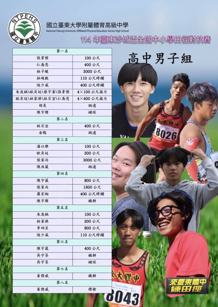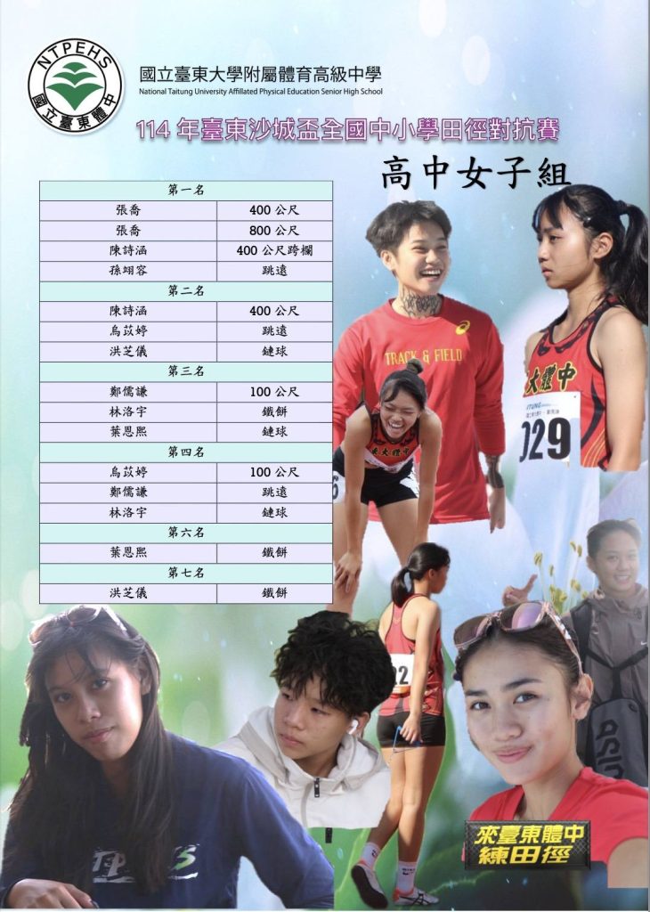 田徑隊》恭喜田徑隊參加「114年臺東沙城盃全國中小學田徑對抗賽」榮獲佳績!Post category:運動榮譽榜Post last modified:2026-02-25Post author:國中部幹事 余家蕙 Post Views: 10Read more articles上一篇文章恭喜~高二乙班古珉憲同學參加「114年全國競技體操錦標賽」榮獲佳績!下一篇文章射箭隊》恭喜射箭隊參加「114年全國總統盃射箭錦標賽」榮獲佳績!