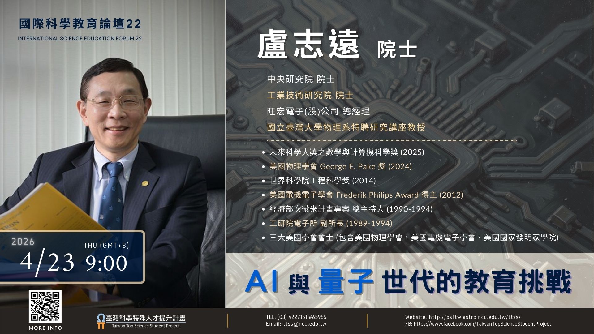 一、 本次講座由現任旺宏電子總經理及欣銓科技董事長的盧志遠院士主講。盧院士同時擔任台灣大學特聘研究講座教授,並長期投身於科技創新及學術研究,憑藉其卓越貢獻,先後獲選為工研院院士與中央研究院院士。盧院士在擔任工研院電子所副所長時,主持當時台灣最大科研計畫「經濟部次微米計畫」,奠定了台灣在全球半導體產業鏈中扮演重要關鍵角色的基石。此次講座將探討在AI與量子世代中不同於以往的教育挑戰。