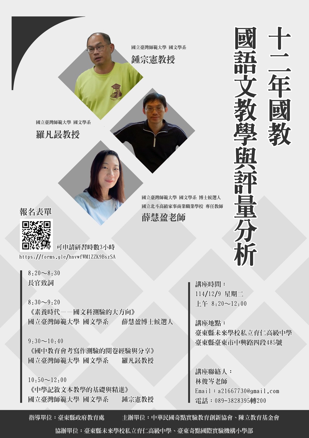 五、 報名方式:自即日起至114年12月8日(星期一)下午5時 止 逕至全國教師在職進修資訊網報名,課程代碼: 5385499或https://forms.gle/hnvwfWM1ZZK9BszSA 指導單位:臺東縣議會、臺東縣教育處 主辦單位:中華民國奇點實驗教育創新協會、陳立教育基金會 協辦單位:未來學校財團法人臺東縣育仁高級中等學校(K12未來學校臺東縣奇點國際實驗教育機構)