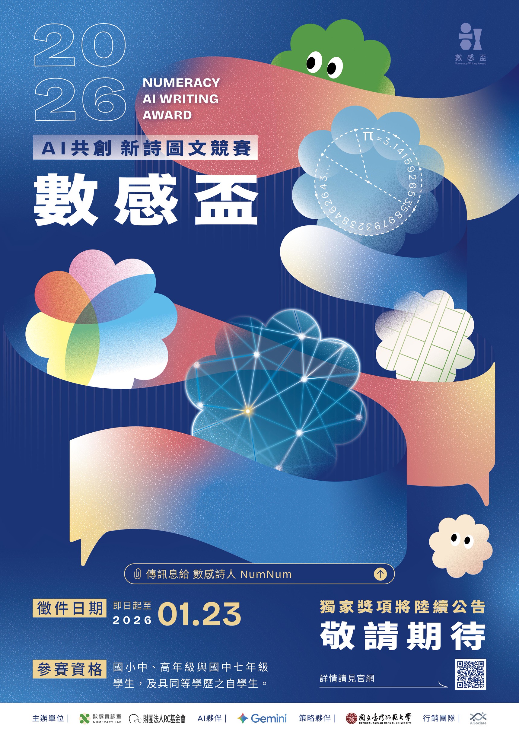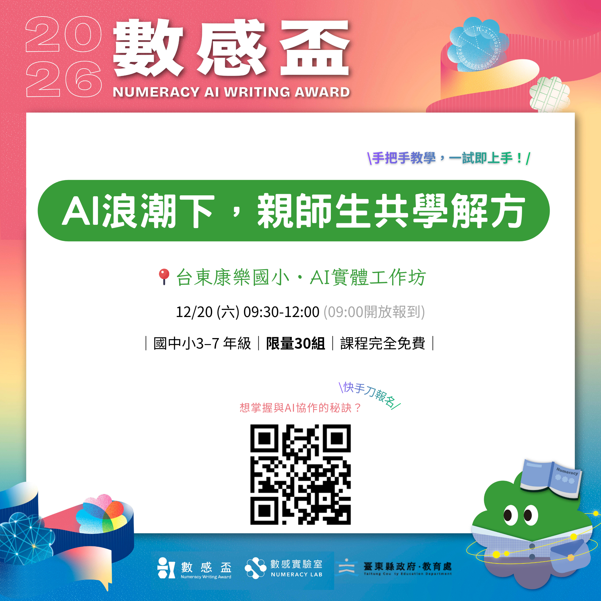 三、 為能促進本縣家長與孩子共同進入AI世界,從互動中學習 AI,並運用數學概念融入創作,合作完成專屬 AI「數學×新詩×圖文」作品並參賽,特辦理一場「臺東縣數感盃:AI共創新詩圖文創作親子工作坊」,資訊如下: