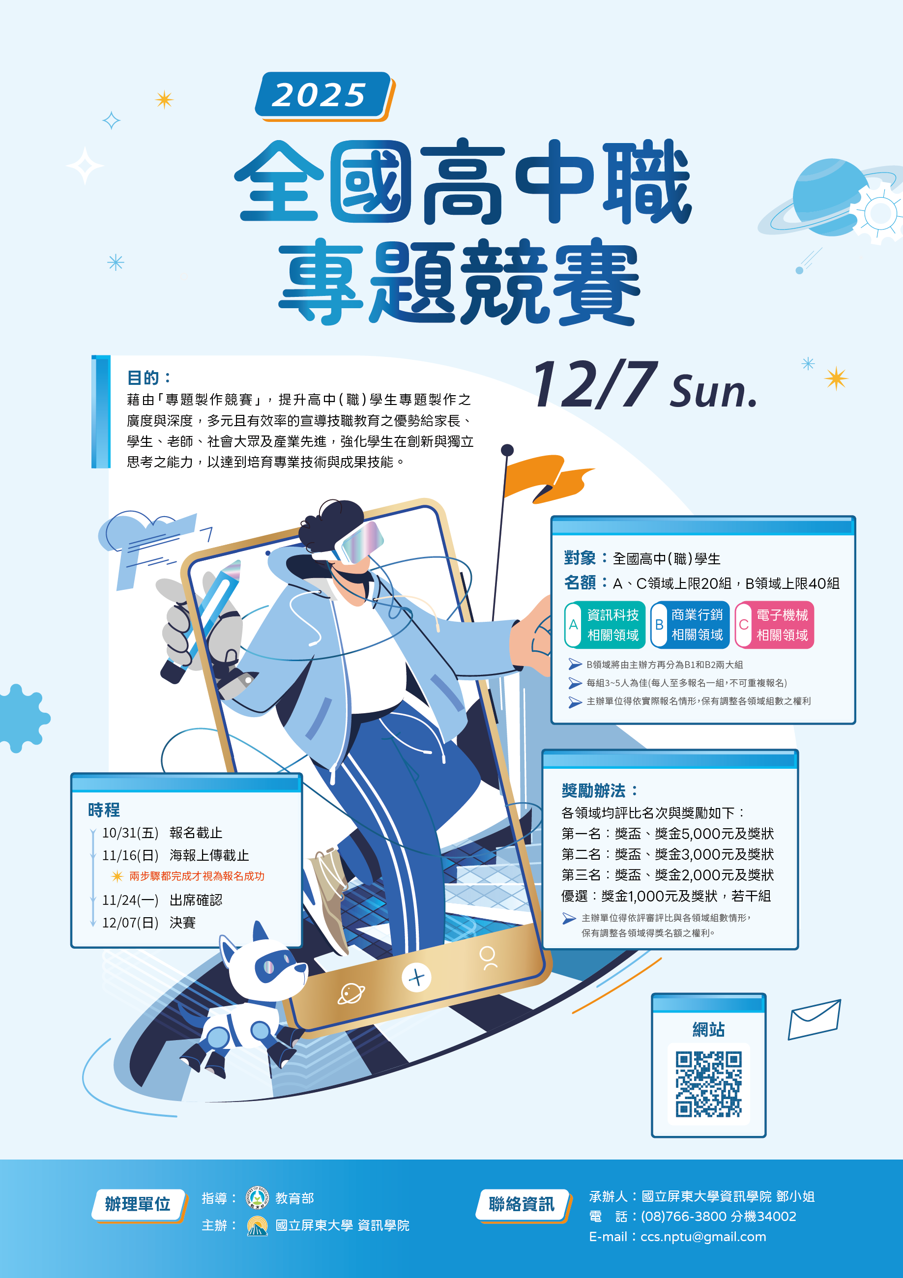國立屏東大學資訊學院舉辦「2025全國高中職專題競賽」活動簡章、海報及常見問題各1份。